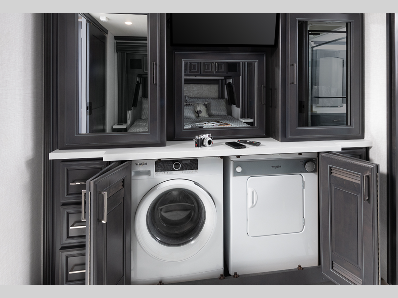 The Cummins L9 engine provides exceptional power, and the Freightliner custom chassis ensures a smooth drive every time. The driver will also appreciate the color backup monitor, the 10.2" stereo with touchscreen navigation, and the LED OptiView instrument panel that will make navigating the road a breeze. Inside, you'll enjoy residential appliances, porcelain tile floors with heat in the living room, residential-style furniture, plus many more luxuries. The three 15K BTU roof A/C's will keep you cool all summer long, plus there is an 8,000-watt Onan quiet diesel generator and 6V deep cycle house batteries to keep you powered up.