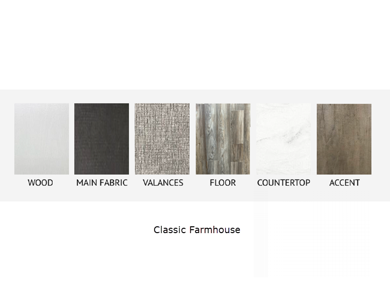 Sleeps 4 Slides 3 Interior Color Classic Farmhouse Tire Size ST235/85R16E Furnace BTU 35000 btu Available Beds King Refrigerator Type 12V Refrigerator Size 16 cu ft Cooktop Burners 3 Shower Size 30" x 48" Number of Awnings 2 LP Tank Capacity 30 lbs Water Heater Type Tankless AC BTU 30000 btu TV Info LR 50" 4K Ultra HD Smart TV Awning Info 11' 6" and 17' Electric with integrated dimmable LED lights Axle Count 2 Washer/Dryer Available Yes Number of LP Tanks 2 Shower Type Standard Electrical Service 50 amp Similar Floorplans