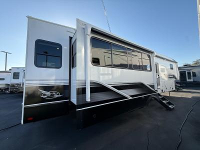 Sleeps 8 Slides 4 Length 42 ft 1 in Ext Width 8 ft 1 in Ext Height 13 ft 4 in Int Height 8 ft 7 in Interior Color Calli Linen Hitch Weight 2580 lbs GVWR 15400 lbs Dry Weight 13115 lbs Cargo Capacity 2285 lbs Fresh Water Capacity 81 gals Grey Water Capacity 87 gals Black Water Capacity 50 gals Tire Size ST235/80R16H Furnace BTU 35000 btu Available Beds King Refrigerator Type 12V Refrigerator Size 16 cu ft Cooktop Burners 3 Shower Size 30" x 48" Number of Awnings 2 LP Tank Capacity 30 lbs Water Heater Type Tankless AC BTU 30000 btu TV Info LR 4K Ultra HD Smart TV Awning Info 10' 6" and 21' Electric with dimmable LED lights Axle Count 2 Washer/Dryer Available Yes Number of LP Tanks 2 Shower Type Standard Electrical Service 50 amp Solar Wattage 200 watts Similar Fifth Wheel Floorplans