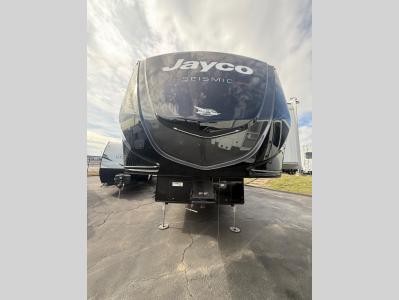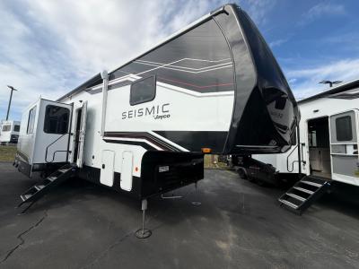 One look at the Seismic toy hauler fifth wheels by Jayco, and you'll never go back! Each model features a custom automotive-grade vinyl exterior graphics package, a painted fiberglass front cap with built-in LED lighting, and 102" wide-body structural steel I-beam construction. You'll find the pass-through storage with Slam-Latch baggage doors will make unpacking easier than ever, and the rear ramp door/patio with anti-slip, non-skid flooring will allow you to unload your toys with no trouble at all. These toy haulers feature a three-season garage wall/doors, a 30-gallon fuel tank with a timer, and exterior marine-grade speakers to keep the party going. The Climate Shield zero degree tested weather protection includes a 35,000 BTU furnace and a fully enclosed and heated underbelly for better protection against the elements. And we haven't even touched on the interior luxuries you'll find, like solid hardwood cabinet doors, residential vinyl flooring made in the USA, night roller shades, and more!