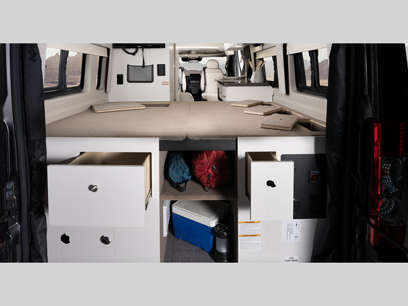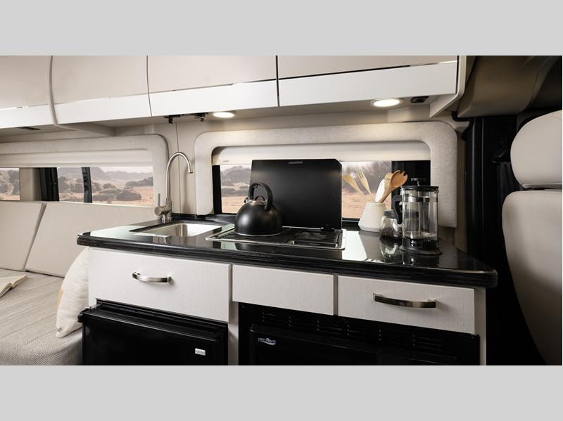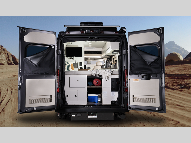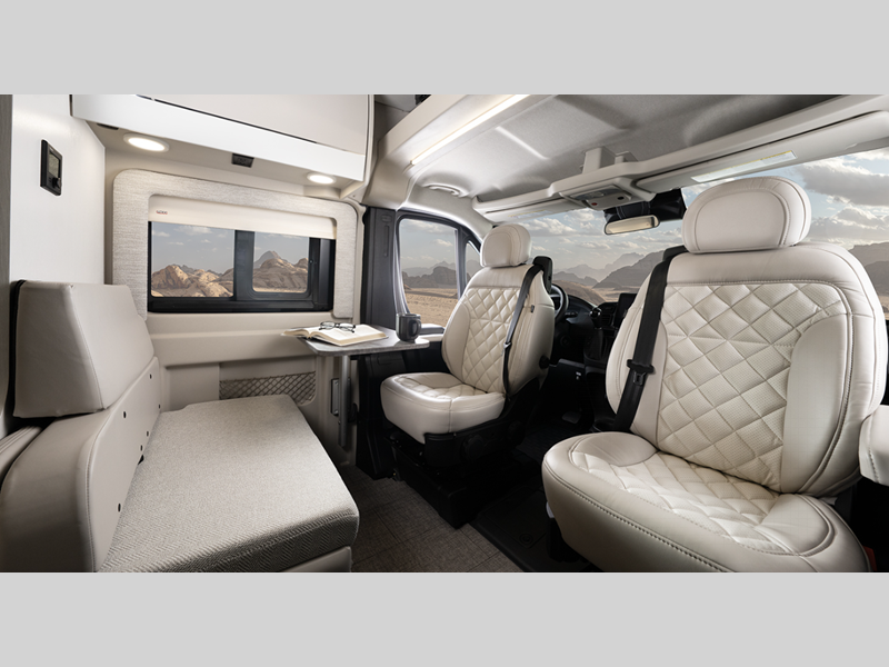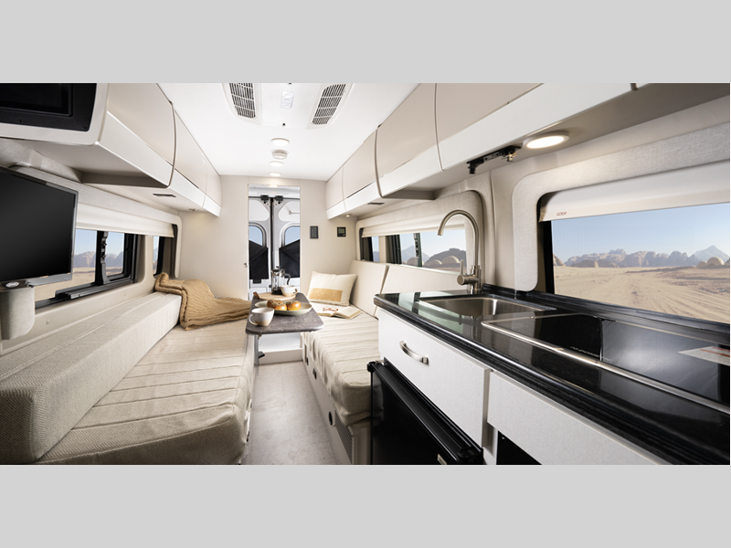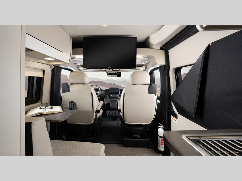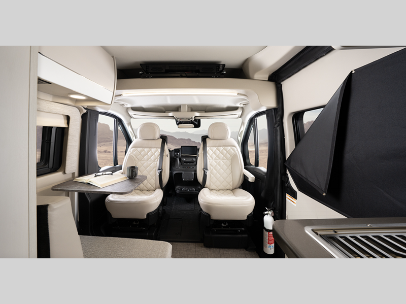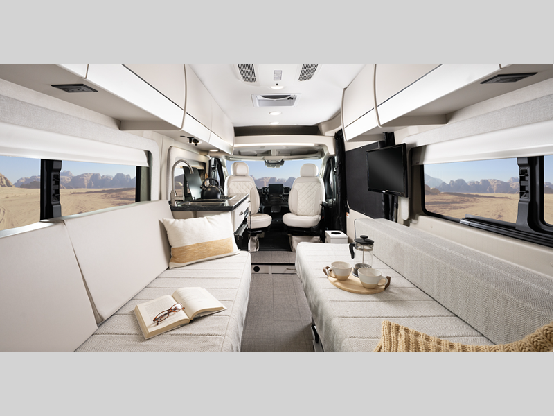 Inside, you'll find Technoform European-style high gloss cabinetry, residential vinyl flooring, and swivel captain's seats for a comfortable driving experience. You will stay powered up with the Onan 2,800W generator and two 12V AGM house batteries, and there is a Thule roof rack to keep your gear secure. The driver will appreciate the Uconnect 5 NAV infotainment center and the ParkView rear backup camera for easy maneuvering.